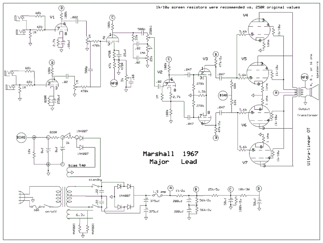 xformer, por esse esquema de Major o resistor de screen original seria 250R, mas recomendam a troca por 1K.