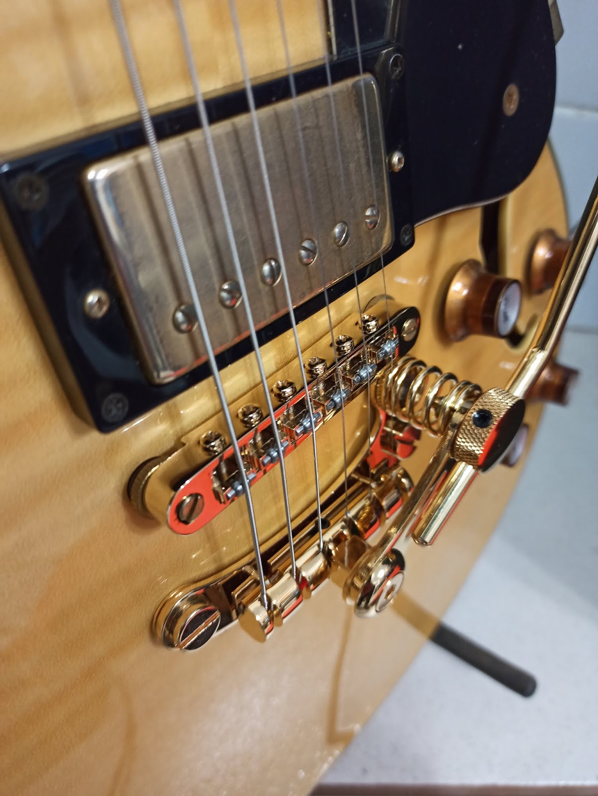 O nut já está grafitado, e a ponte com os rollers deve melhorar a estabilidade do sistema. Essa guitarra, mesmo sem locking tuners (são Grover), não desafina, a danada. Além de ser muito bonita, a meu ver, toda em flamed maple de verdade, não é folha decorativa, no tampo e atrás. Ação baixa, braço fino, não trasteja, timbre aveludado, tem um bloco central maciço, muito estável. Recomendo o modelo...