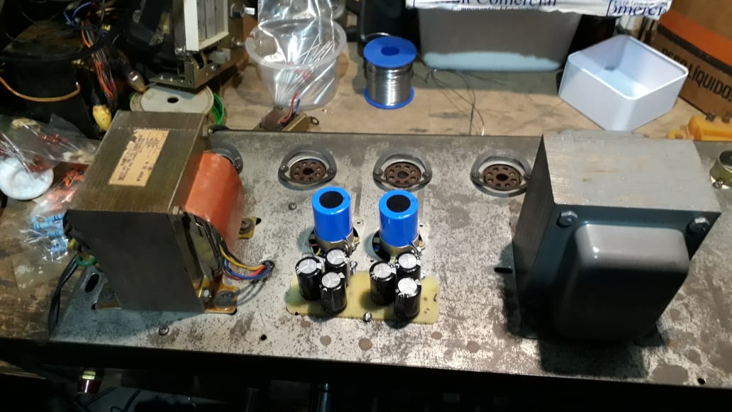 Problemas: Mau funcionamento geral, som baixo, aquecimento, distorções. Serviço: Troca de todos os capacitores, eletrolíticos e à óleo. Se os "sabe tudo de mojo" vissem o que capacitores à óleo acabam por fazer, nunca mais comprariam essa bomba relógio....