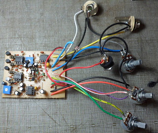 Na foto, bem ao lado direito do jack da fonte tem um fio vermelho, marcado na placa como +9V, que eu não sei pra onde vai. Imagino que seja para a bateria... De qq modo, no primeiro teste o pedal não ligou, nem oo led acendeu. Tá certo que eu ainda não conferi a placa, pois a ansiedade não deixou...