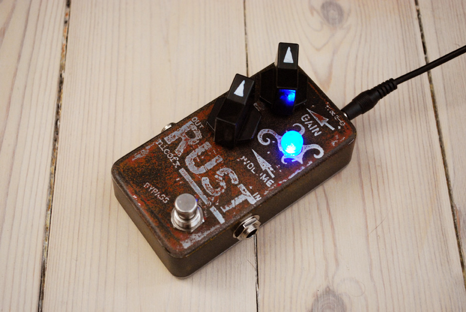 Peguei a caixa estragada, dei um "banho rápido" nela toda com solução de percloreto um pouco mais fraca, o alumínio oxidou, ficou áspero e com jeito de sucata enferrujada. Apliquei um pouco de tinta marrom fosca para deixar com cara ainda mais sucateada. Acabei ficando com um pedal "rat rod"... Ficou legal e não perdi a caixinha...